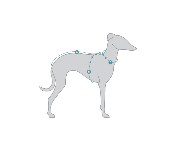 A. Longueur : prenez la mesure du point du cou (garrot) jusqu’à la base de la queue.